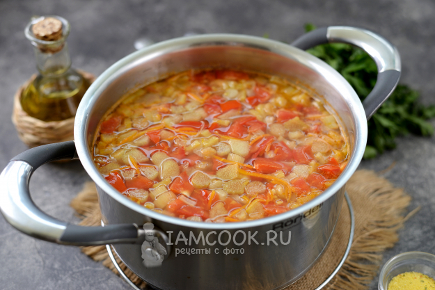 Добавьте в суп измельченный ревень и нарезанный кубиком спелый помидор. Варите минут 5-7.