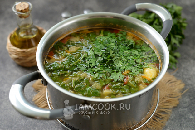 Если вкус супа вас устраивает, всыпьте нарубленную свежую зелень, хорошенько все перемешайте и выключите плиту. Оставьте щи под крышкой настояться минут на 15 минимум.