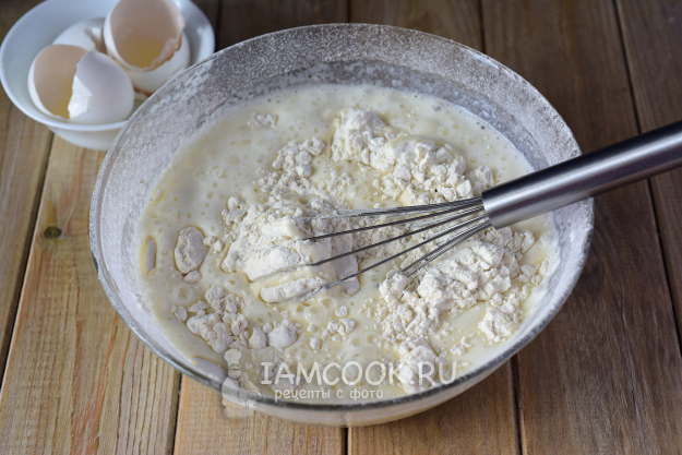 Полученную смесь залить к просеянной муке. Венчиком активно все перемешать.