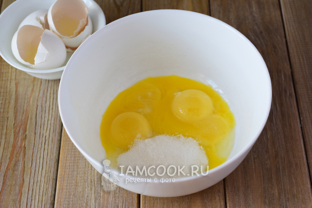 В отдельную миску выложить желтки, добавить ванилин и сахар.