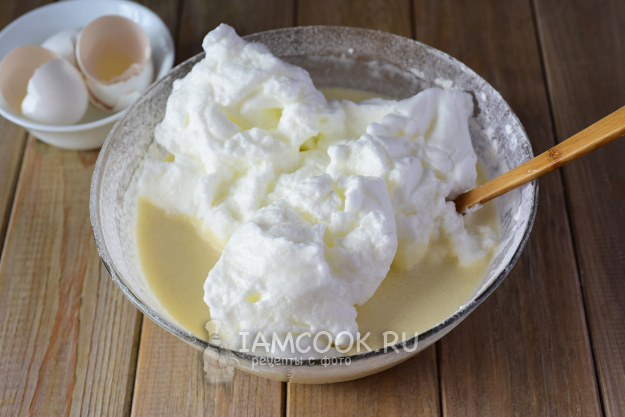 Ложкой или кондитерской лопаткой бережными движениями вмешать белки до получения воздушного, достаточно жидкого теста.