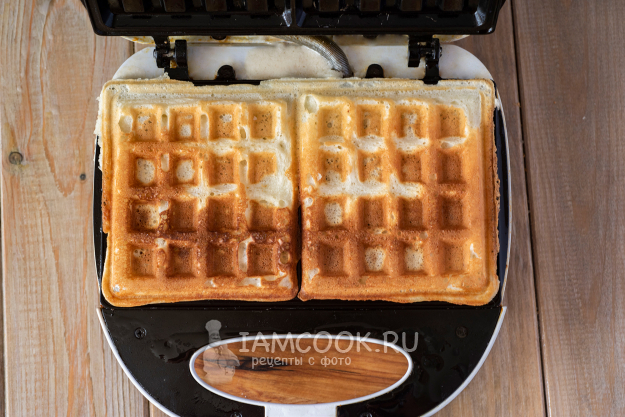Смазать тонким слоем растительного масла решетки рабочей поверхности электрической вафельницы, включить разогреваться. На хорошо разогретую поверхность вафельницы столовой ложкой выложить тесто так, чтобы решетки полностью покрылись. Устройство закрыть и выпекать вафли несколько минут (в зависимости от мощности вашего устройства). У меня одна пара вафель выпекается три минуты.