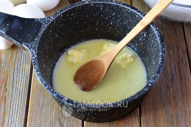 Выложить сливочное масло в сотейник, на минимальном огне растопить. Снять с плиты и немного охладить.