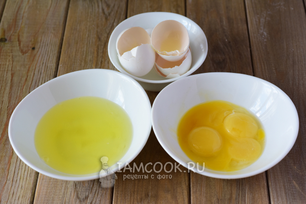 Белки выложить в отдельную сухую миску, добавить к ним соль. Миксером на максимальных оборотах взбивать примерно 2-3 минуты до получения устойчивых белковых пиков. Чтобы проверить устойчивость белковой массы, можно перевернуть миску вверх дном - белки должны оставаться неподвижными.