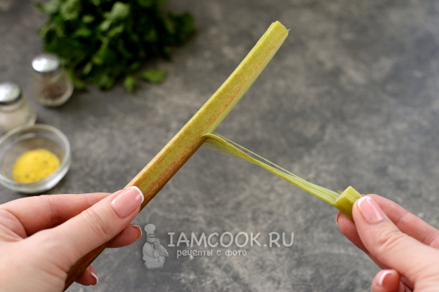 Спустя время очистите ревень от жесткой оболочки, нарежьте стебли тонкими слайсами.
