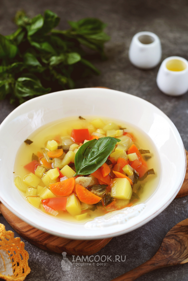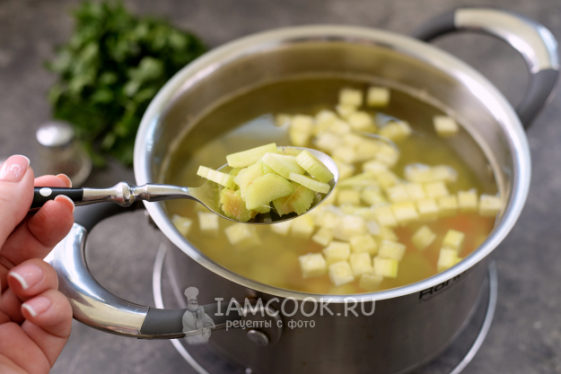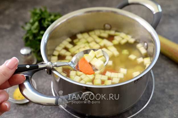 Спустя время положите в бульон нарезанный кубиком кабачок и тонко нашинкованную морковь. Варите суп еще минуты 3-4.