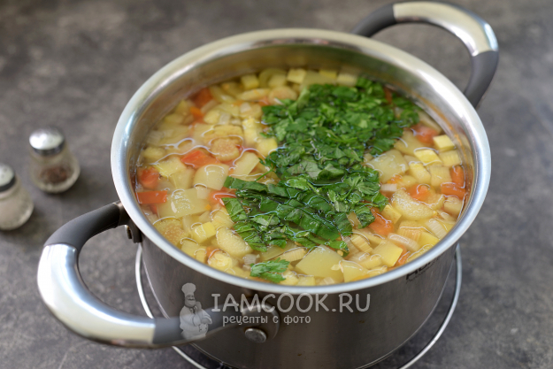 Теперь осталось попробовать бульон на вкус: если слишком кисло, тогда можно добавить сахара по вкусу. Дальше всыпьте нарубленную свежую зелень. Готовый суп перемешайте, выключите плиту, оставьте под крышкой настояться минут на 10 минимум.