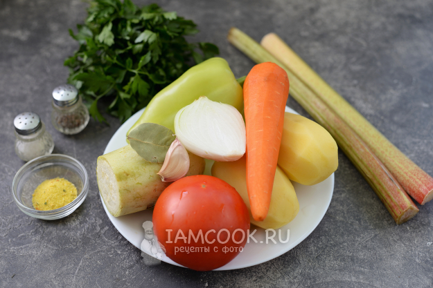 Подготовьте необходимые продукты для супа из ревеня. Картофель, лук и морковь почистите, помойте под проточной водой.