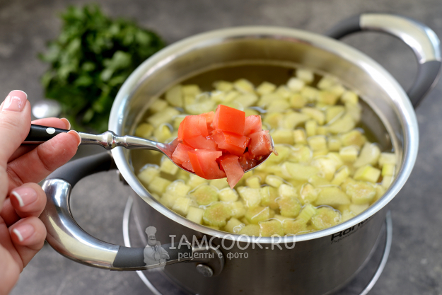 Сразу же добавьте нарезанный кубиком спелый помидор, варите суп минут 5. Спустя время положите раздавленный зубчик чеснока, лавровый лист, соль и перец по вкусу. Также всыпьте универсальную приправу по вкусу, сейчас продается большое ее количество без ГМО и с припиской "органик".