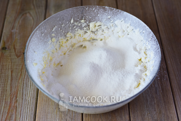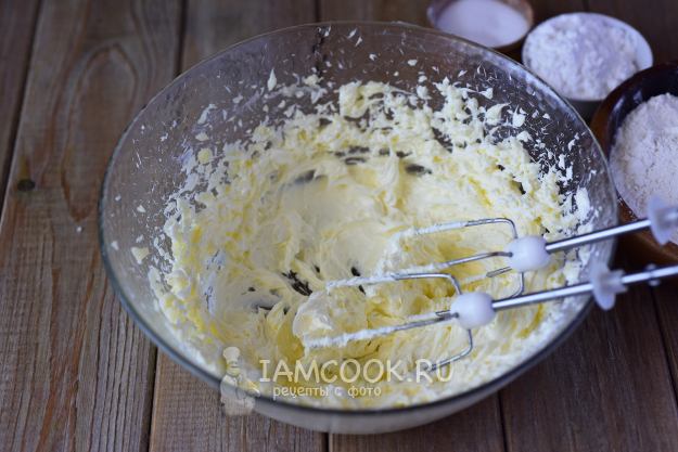 Взбить ингредиенты миксером в однородную пышную массу. Чтобы сахарная пудра хорошо растворилась в масле и смесь приобрела предельную пышность, я взбивала 5 минут.