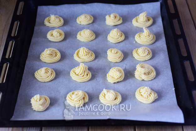В кондитерский мешок с насадкой «звездочка» выложить порцию приготовленного теста. Противень застелить пергаментом для выпечки. Отсадить тесто небольшими порциями на противень, формируя заготовки печенья. Заполненный противень поставить в уже разогретую до 180 градусов духовку.