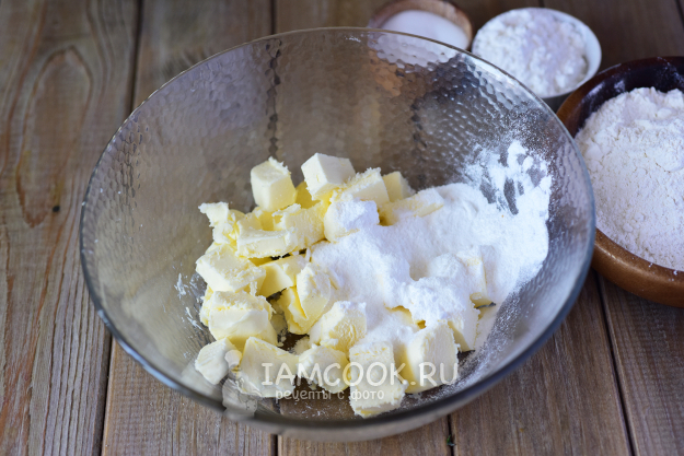 В миску выложить нарезанное кусочками мягкое масло, добавить сахарную пудру, ванилин и соль.