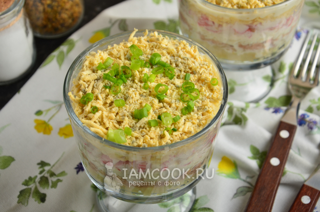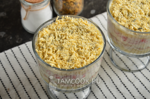 Разомните желтки вилкой или натрите на мелкой терке. Аккуратно присыпьте салат сверху. Можно накрыть порции пищевой пленкой и поставить в холодильник на пару часов.