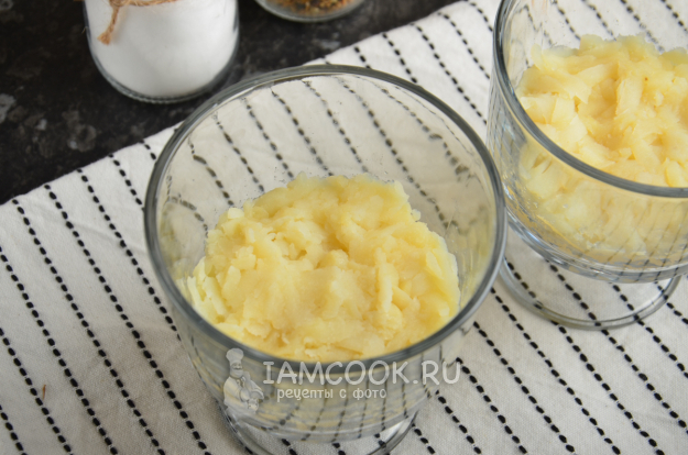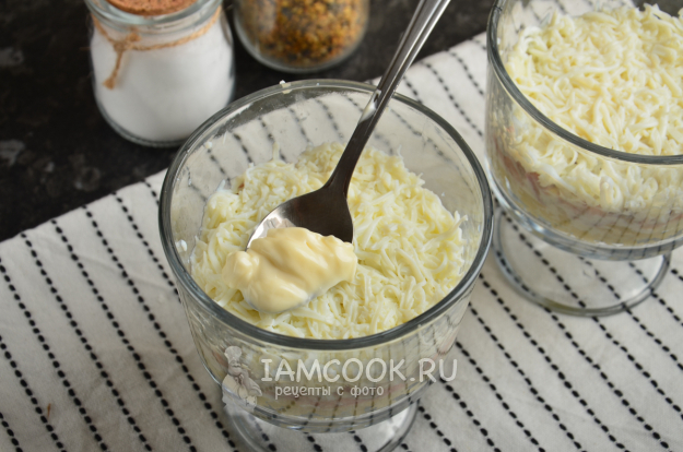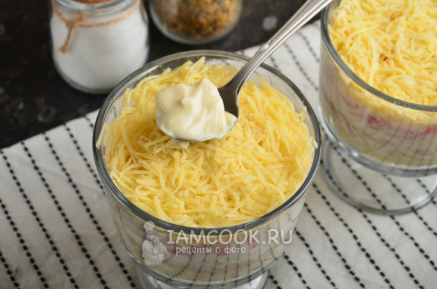 Картофель очистите от кожуры, натрите на крупной терке. Я для салата использовала небольшие стеклянные бокалы на ножках - по одному на порцию. На дно формочек нужно выложить тертый картофель. Этот слой майонезом смазывать не обязательно.