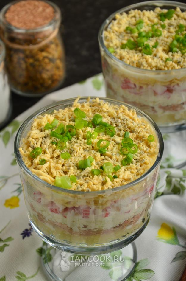 Перед подачей присыпьте слоеный салат мелко нарезанным зеленым луком. Салат «Аристократ» с тунцом и крабовыми палочками готов к дегустации.