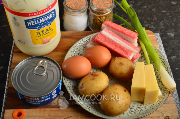 Подготовьте все нужные продукты для салата «Аристократ» с тунцом и крабовыми палочками. Картофель сварите в кожуре, вкрутую сварите яйца. Все остудите. Крабовые палочки можно взять охлажденные, а если они были заморожены - дать оттаять.