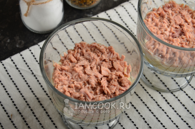 Далее достаньте из банки консервированного тунца, дайте стечь лишней жидкости или маслу. Измельчите рыбу вилкой и разложите по пиалам.