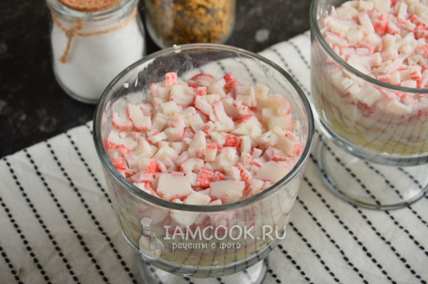 Крабовые палочки очистите от целлофановой оболочки и мелко нарежьте, выложите сверху на белки и утрамбуйте.
