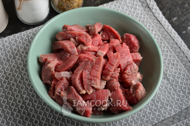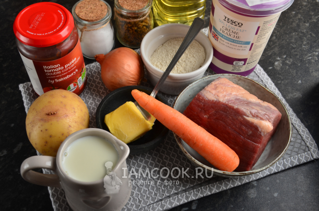 Подготовьте все продукты для картофельного пюре с гуляшом из говядины. Сразу можно помыть охлажденную говядину и обрезать все лишнее. Также нужно отмерить муку, сливочное масло, молоко.