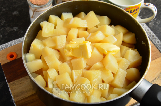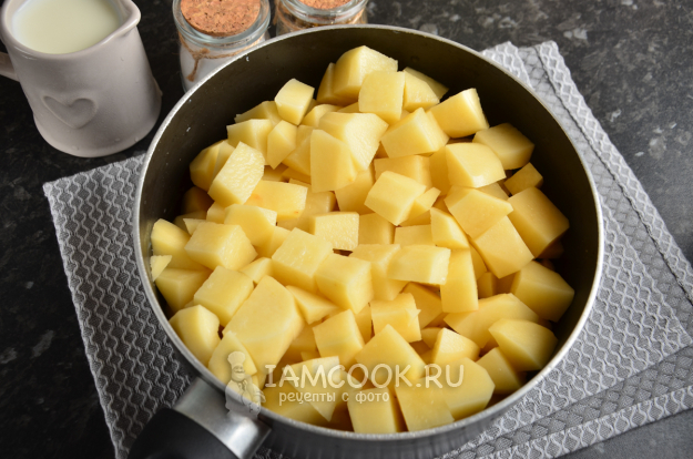 Слейте воду из кастрюли с картофелем, добавьте молоко и сливочное масло. Сделайте пюре без комочков.
