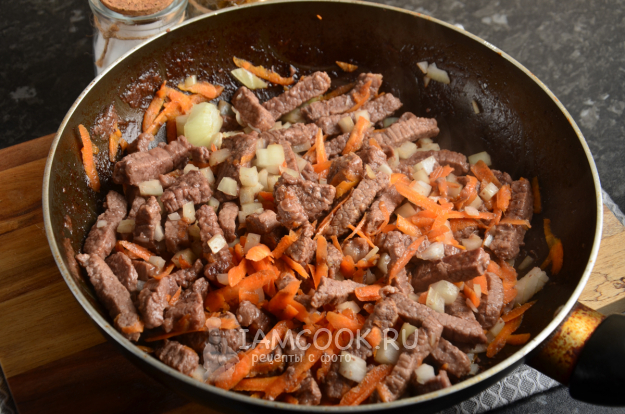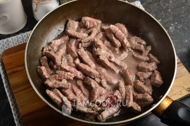На сковороде раскалите рафинированное масло, затем выложите жариться говядину. Сделайте средний огонь и помешивайте мясо.