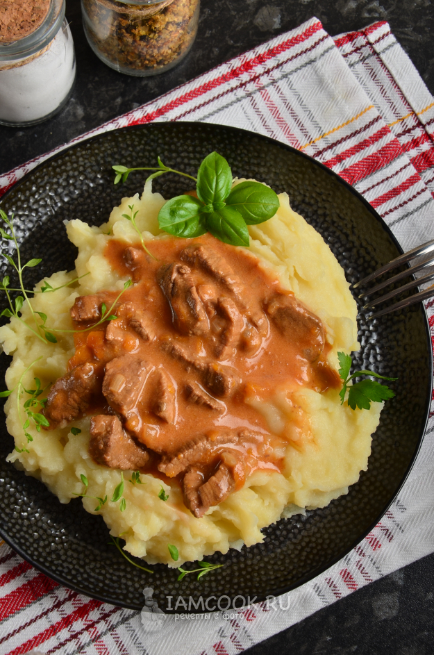 К столу картофельное пюре с гуляшом из говядины подавайте сразу же, пока всё горячее.