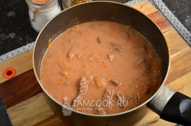 Сделайте заправку из 200 мл воды, сметаны, пшеничной муки и томатной пасты. Размешайте венчиком, чтобы не осталось комочков.