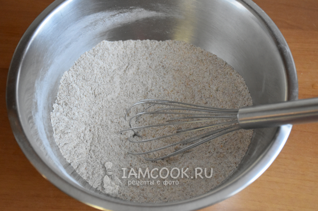 В миске соединить ржаную муку, соду, соль и хорошо перемешать венчиком до равномерного объединения сухих ингредиентов.