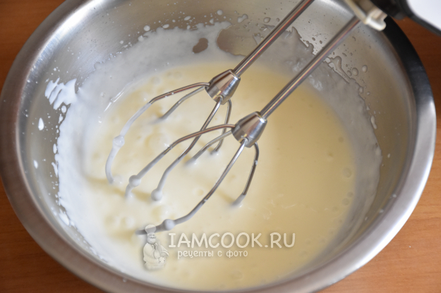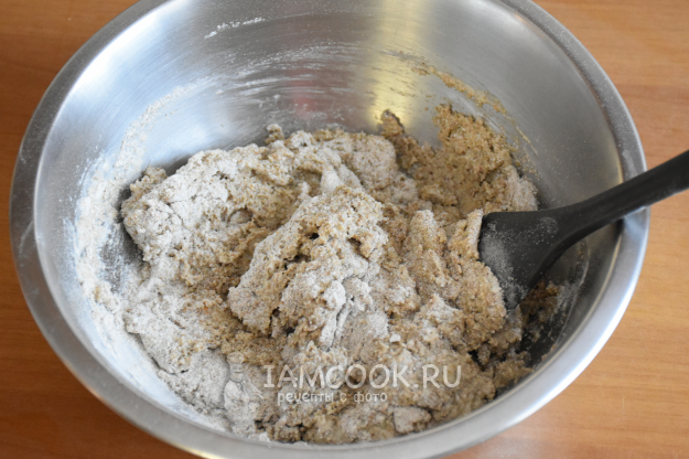 В миску с сухими ингредиентами постепенно влить жидкую массу, каждый раз хорошо перемешивая тесто.