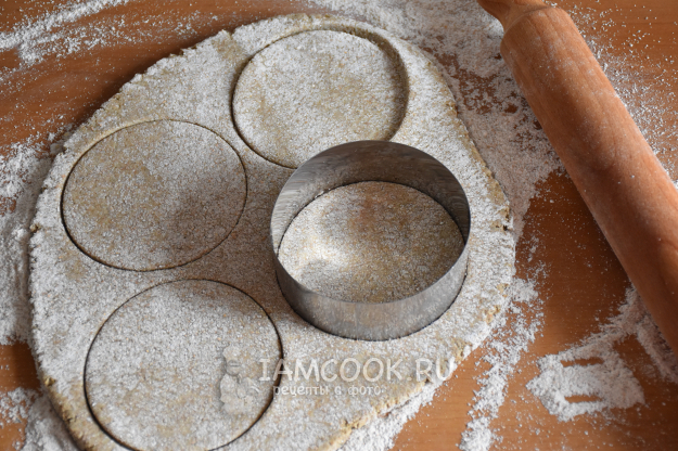 На присыпанной мукой рабочей поверхности раскатать тесто в пласт толщиной 1 см и при помощи формочки диаметром 9 см вырезать круги.