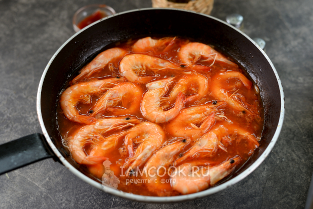Выложите в соус креветок, томите на тихом огне минуты 2-3, не дольше, поскольку они уже предварительно отварены производителем. Если передержать, то получится очень вкусная резина в томатном соусе))