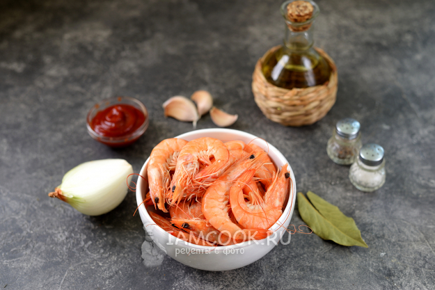 Для приготовления креветок в томатном соусе необходимы следующие продукты. Креветок предварительно разморозьте при комнатной температуре, усы желательно удалить.