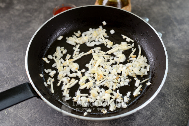Разогрейте в сковороде растительное масло, выложите в него нарезанный мелким кубиком репчатый лук, обжарьте до слегка золотистого цвета, добавьте измельченный чеснок, уменьшите огонь. Чеснок не должен стать золотистым, иначе готовый соус будет горчить, так что держите его вместе с луком не дольше минуты. Чеснок я нарезаю соломкой: если его кто-то не ест, то всегда сможет отодвинуть на край тарелки, соломку очень хорошо видно в готовом соусе.