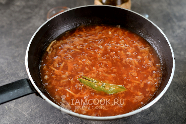 Дальше положите в сковороду томатную пасту и лавровый лист.