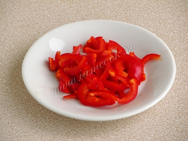 У стручка сладкого перца удалить плодоножку и семяносцы с семенами, разрезать его вдоль на четыре части, а затем каждую четвертинку нарезать поперёк тонкой соломкой.