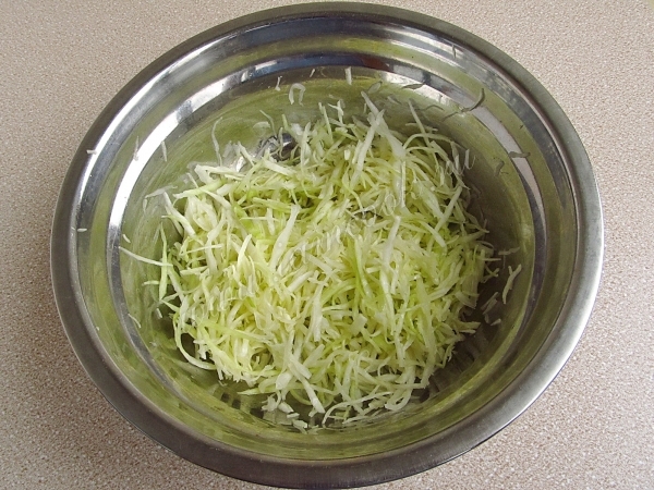 Белокочанную капусту тонко нашинковать и перетереть с солью.
