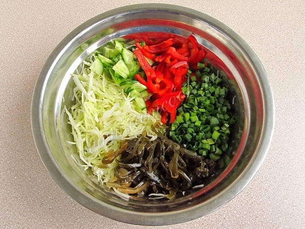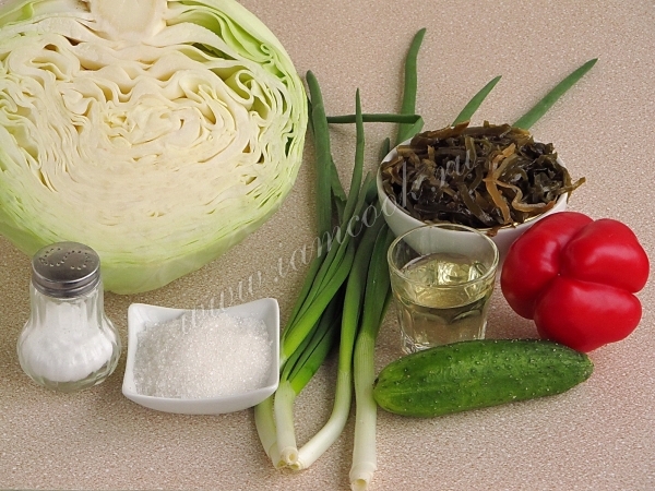 Для приготовления салата нужно взять свежую белокочанную капусту, маринованную морскую капусту, красный сладкий перец, свежий огурец небольшого размера, зелёный лук, нерафинированное подсолнечное масло, сахар и соль.