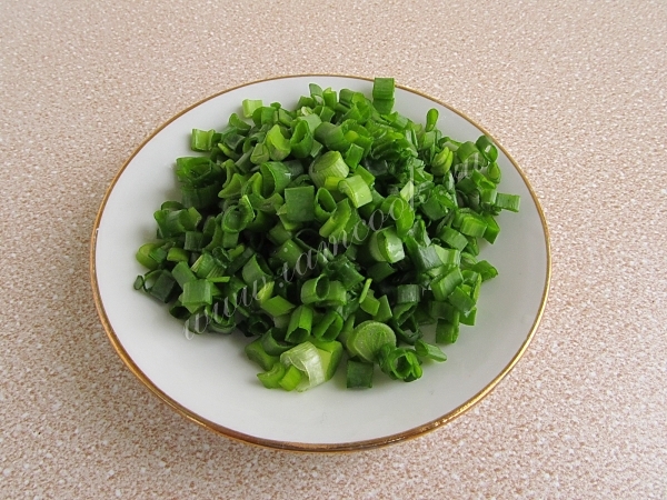 Зеленый лук вымыть, обсушить и нарезать тонкими колечками.