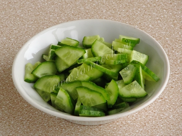 Огурец разрезать вдоль на 4 части, а затем каждую четвертинку тонко нашинковать поперёк.