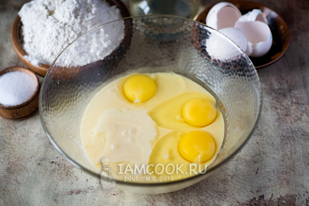 В просторную миску вбить яйца, залить сгущенку, добавить соль.