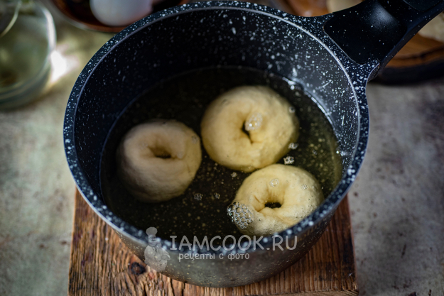 В удобную кастрюлю залить такое количество растительного масла, чтобы заготовки калачиков полностью покрывались маслом. У меня ушло 400 мл. Поставить кастрюлю с маслом на средний огонь. Когда масло хорошо разогреется, выложить несколько заготовок калачиков.