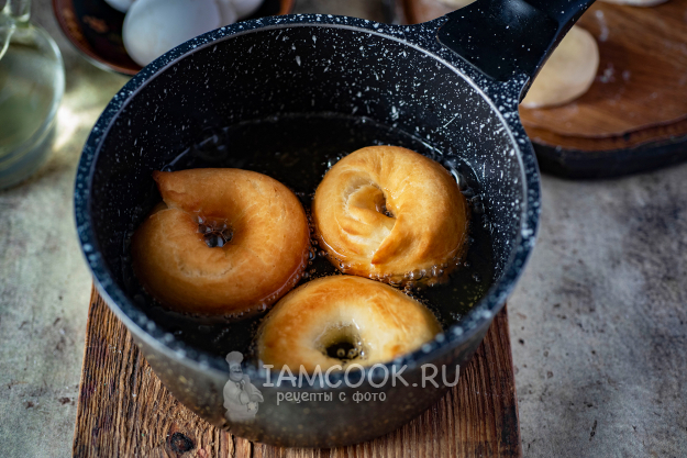 Постоянно переворачивать калачики ложкой, чтобы они равномерно обжарились со всех сторон до золотистого оттенка.