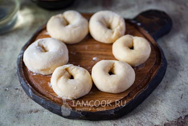 Отделить от общей массы небольшую часть теста (весом в 50-60 г) и скатать жгутик длиной примерно 10-12 см. Соединить концы жгутика и скрепить их пальцами в виде колечка. Таким образом поступить со всем тестом.