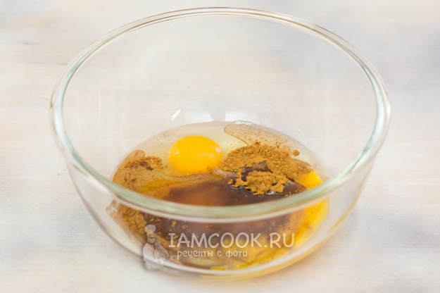 Смешайте яйцо, масло, сахар, корицу, мед и соль.