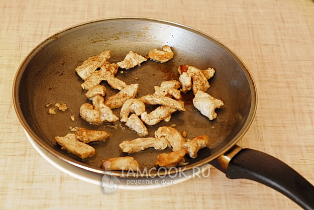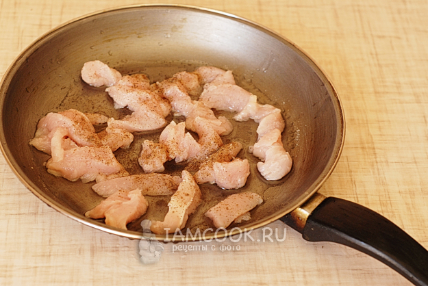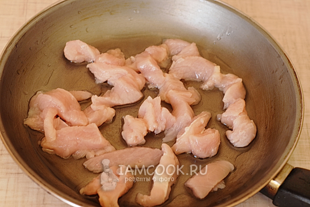 На сковороду нальем подсолнечное масло, выложим кусочки индейки.