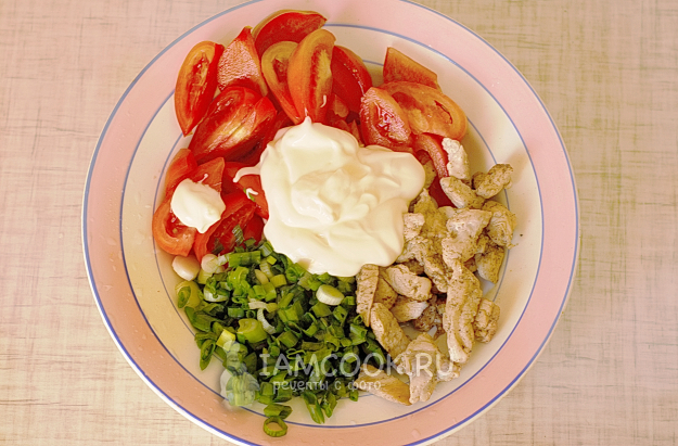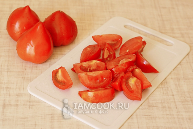 Моем, режем помидоры среднего размера кусками и выкладываем поверх лука.