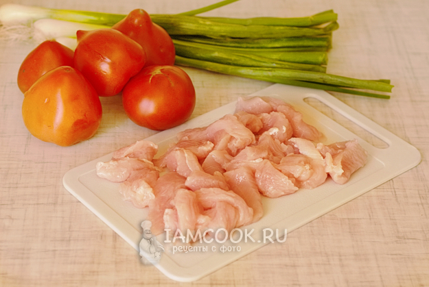 Индейку промоем, нарежем небольшими кусочками, 2-3 см длиной.