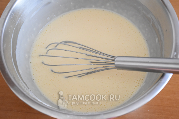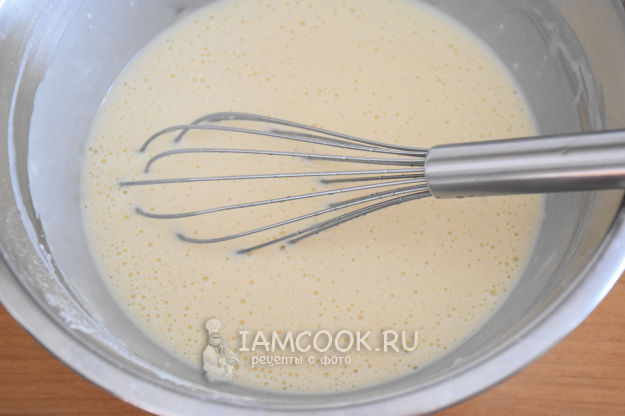 Влить кефир в яичную смесь и хорошо перемешать венчиком или миксером на минимальной скорости.