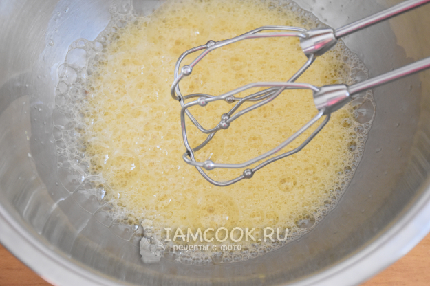 Сливочное масло растопить в сотейнике и остудить до комнатной температуры. Взбить миксером яйца, растопленное сливочное масло, сахар и щепотку соли до получения светлой пышной массы.