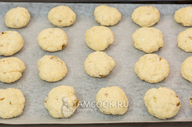 Из теста сформируйте шарики, выложите их на противень, слегка приплюсните.